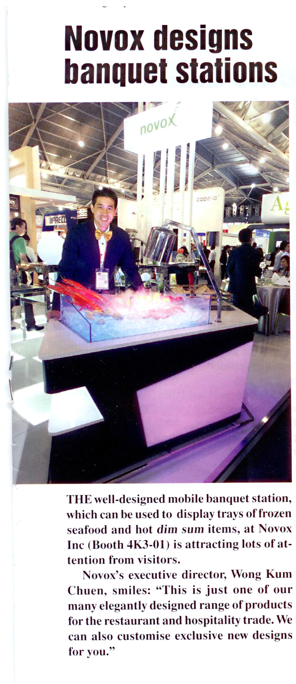 The well-designed mobile banquet station, which can be used to display trays of frozen seafood and hot dim sum items, at Novox Inc (Booth 4K3-01) is attracting lots of attention from visitors.